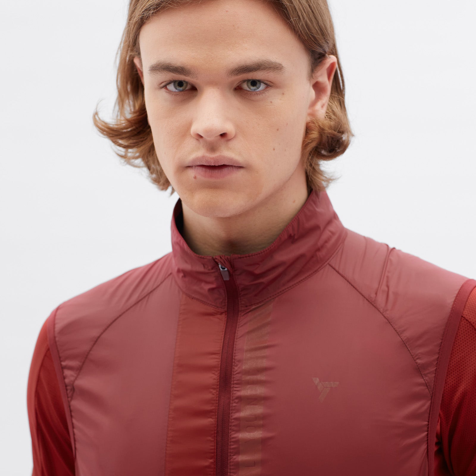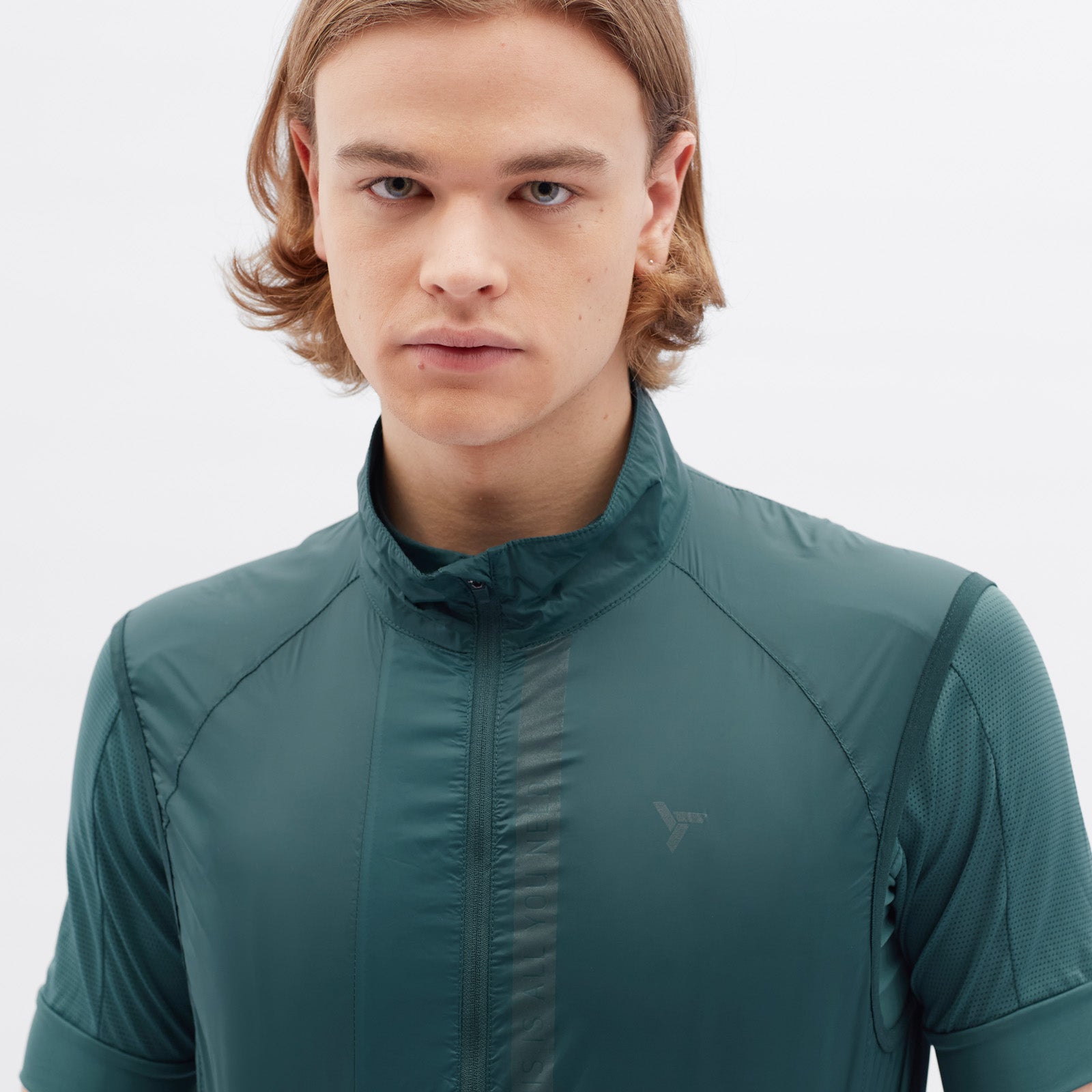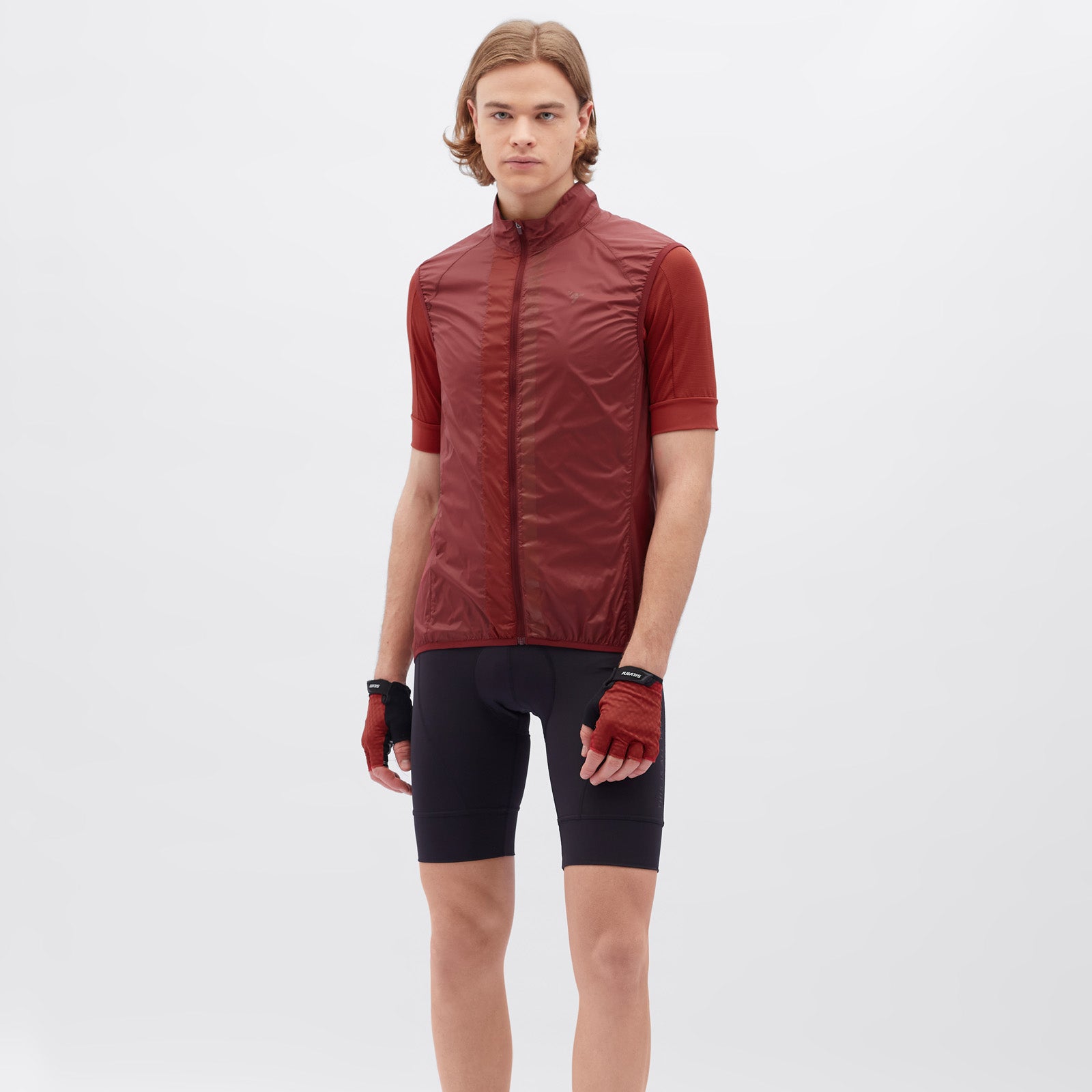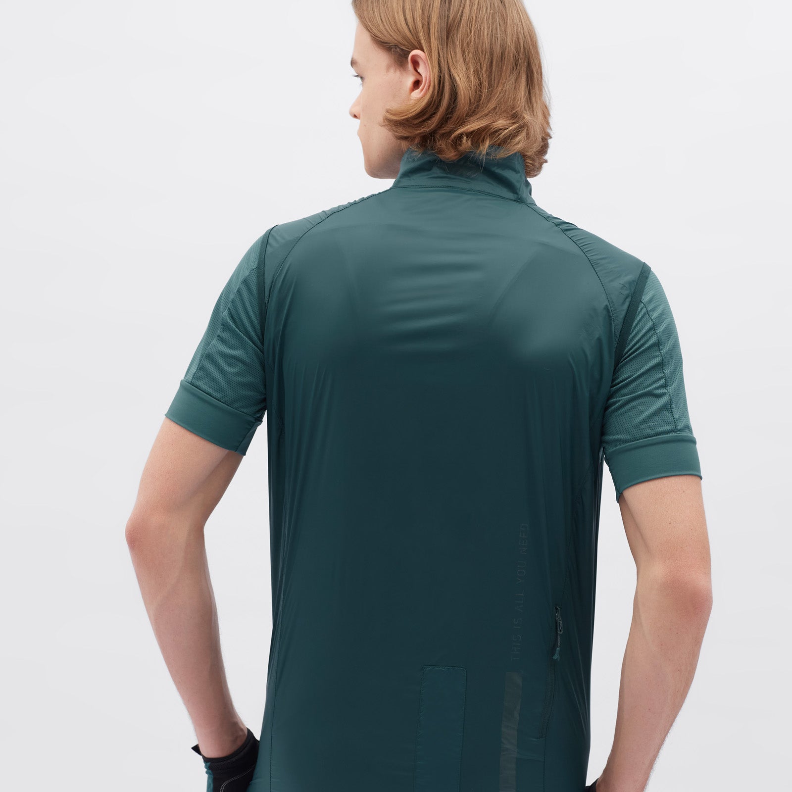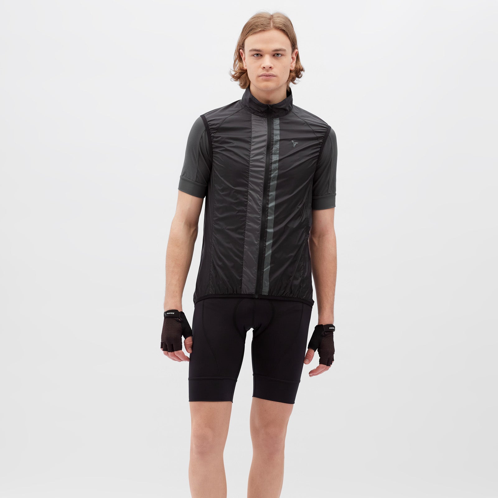 The men's cycling vest is made of windproof, light and densely woven material. It packs down easily and has an extended back section with a vertical zip pocket. The vest includes reflective elements.