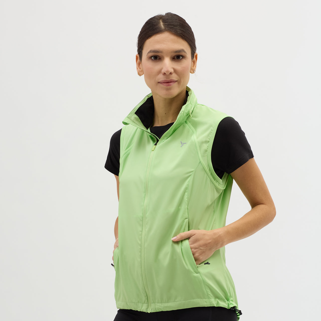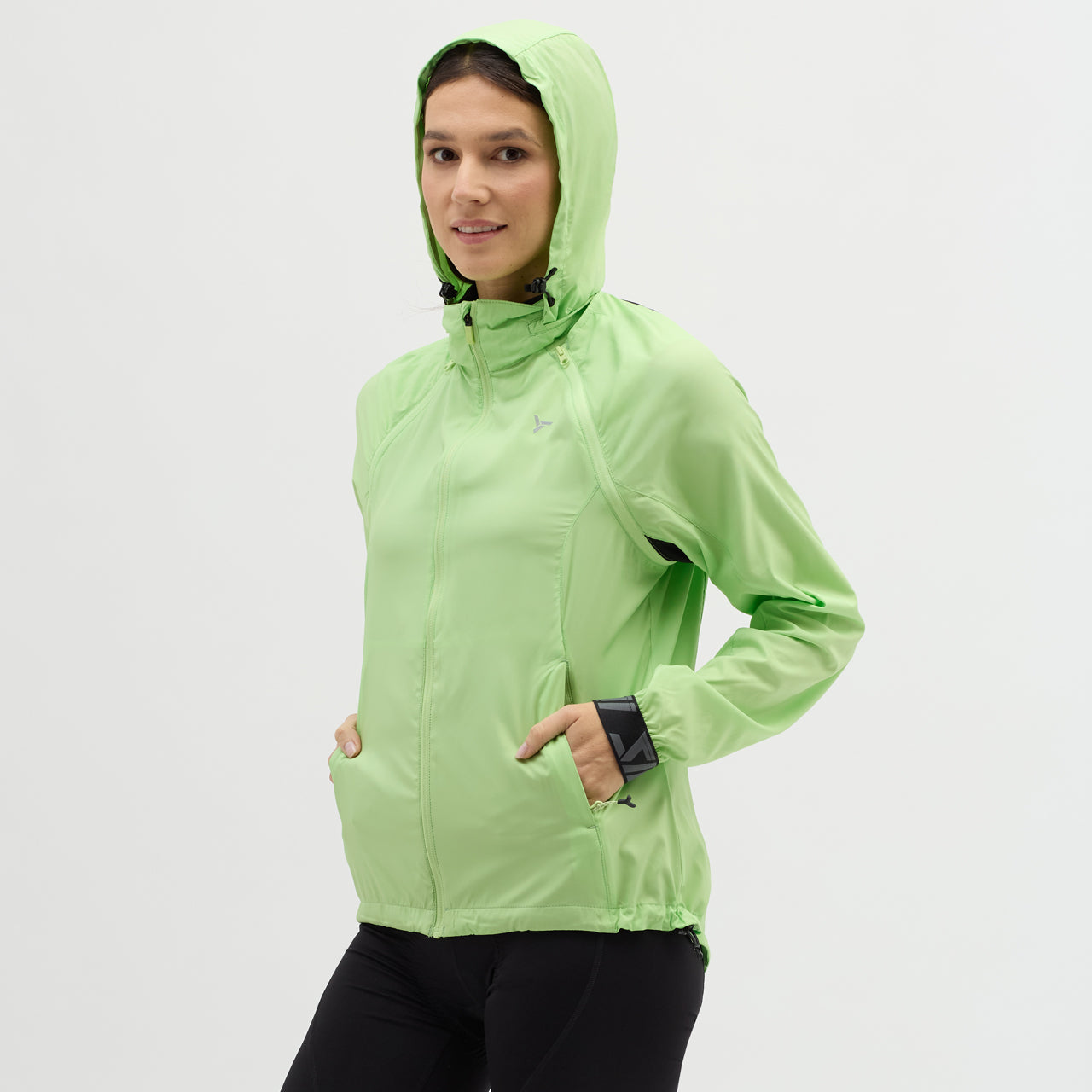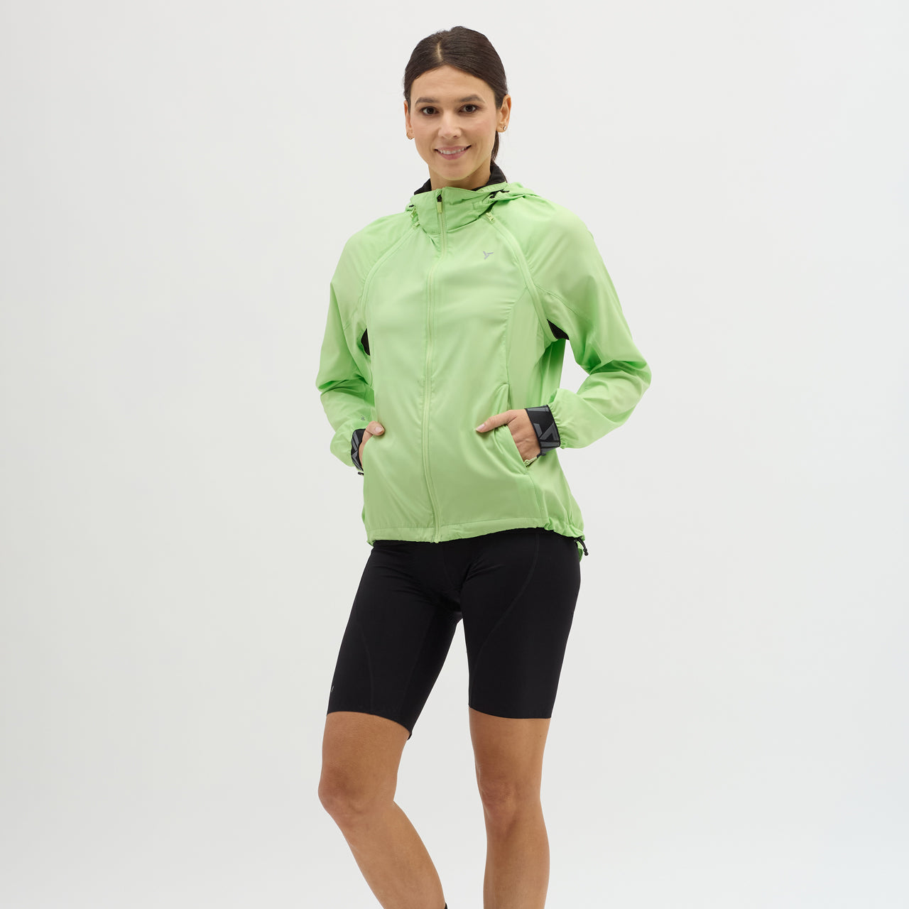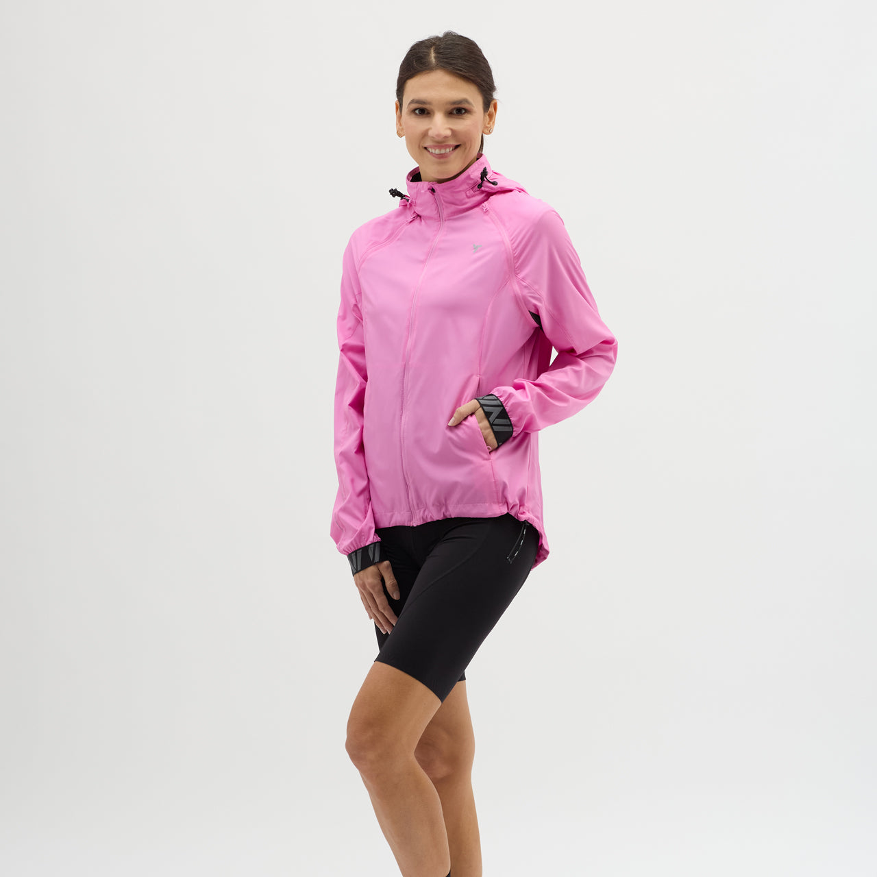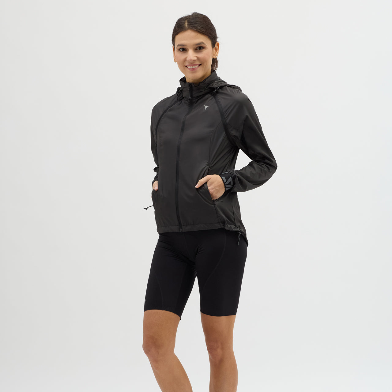 Women's windproof jacket made of Windbreaker material, packable in a small bag. By unbuttoning the sleeves, it turns into a vest, the hood can be folded into the collar. It has three zipped pockets, lower hem closure and reflexes.