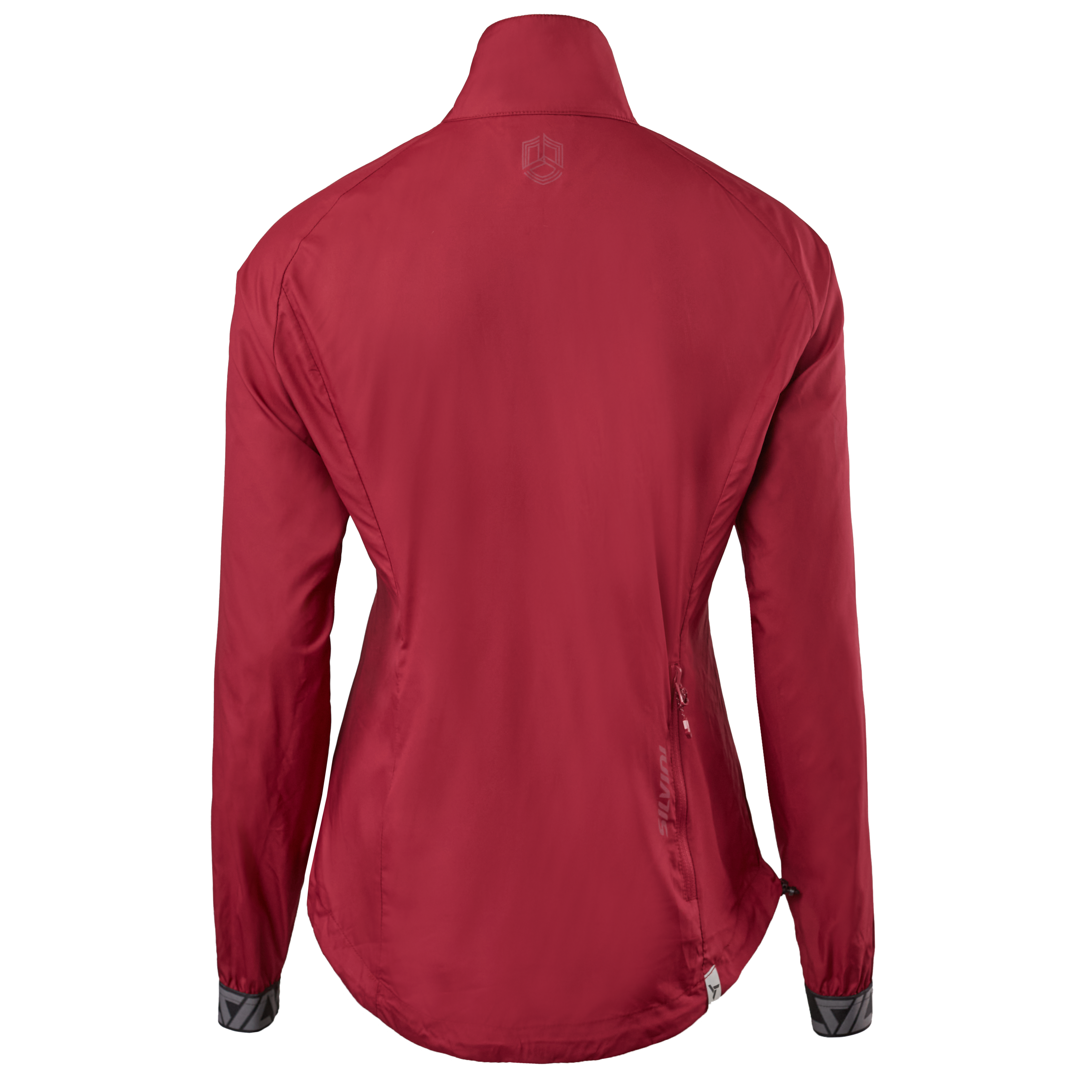 Women's windproof jacket adapted for riding a gravel bike made of Windbreaker material. The jacket is very light and easy to pack. It has a loose fit, several reflective elements and a back zipped pocket.