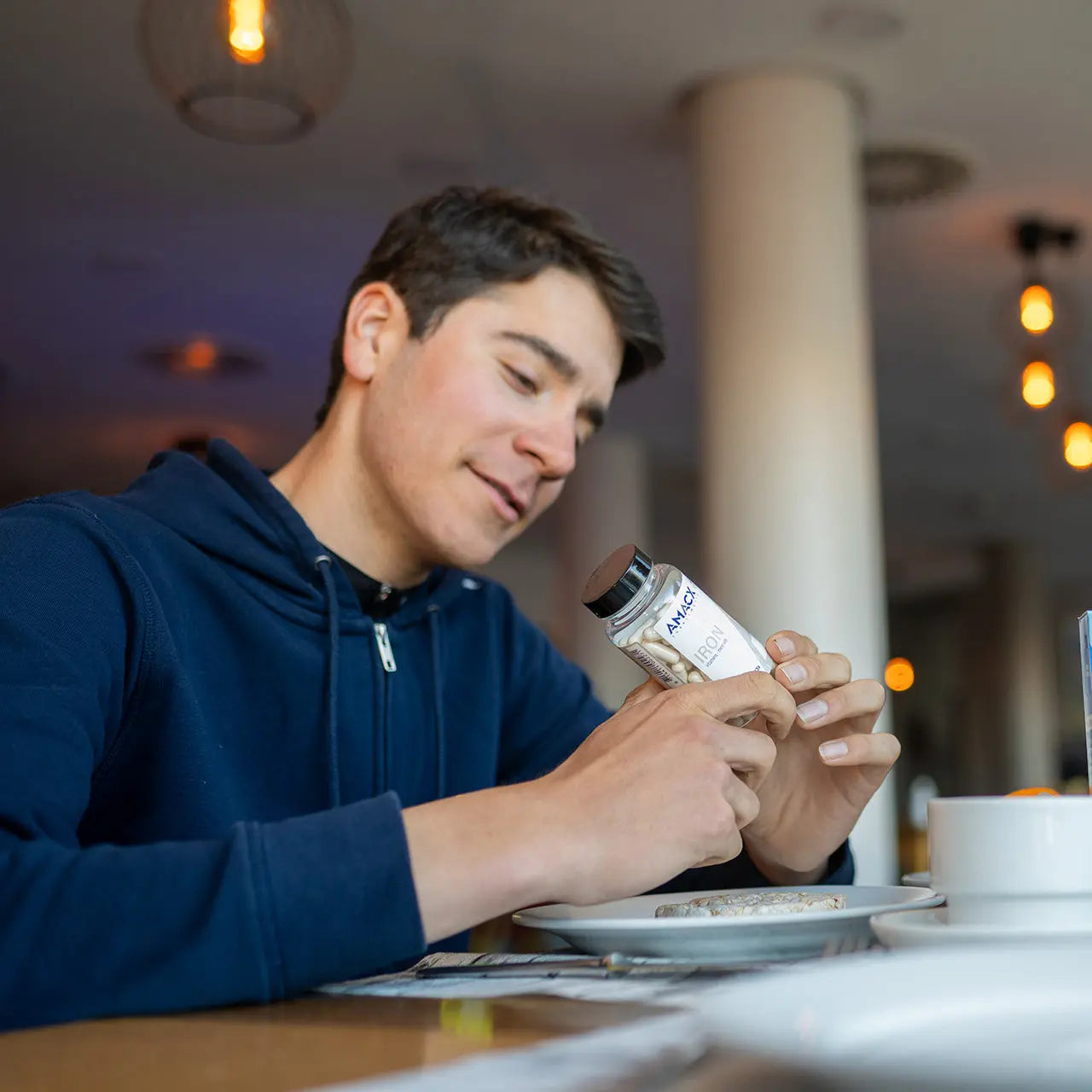 Amacx Iron supports energy levels and aids in the normal transport of oxygen in the body. Additionally, it boosts the body's immune system. Iron is a crucial mineral, especially in the realm of sports, as it is necessary for the production of hemoglobin. Hemoglobin resides in your red blood cells, facilitating the transportation of oxygen throughout your entire body. During endurance sports, such as running or cycling, ensuring an ample supply of oxygen to your muscles is crucial. Amacx Iron contributes to extra energy during fatigue, providing direct support to your sports performance.
