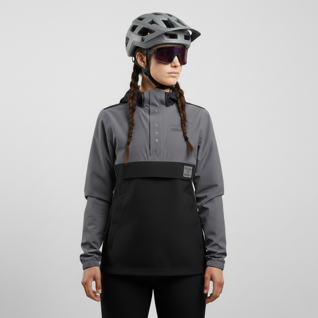 Veste pour femme conçue pour le gravel biking, dotée d'une membrane Power Strong, d'une coupe ample, d'un dos allongé, d'une capuche amovible et de poches pratiques.